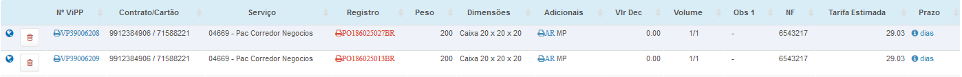 Todos os objetos na grid foram baixados pela unidade postadora, porem ainda é possível interagir com Nº ViPP, Registro e Adicionais sua interação seria a re-impressão ou por algum motivo necessite baixar novamente um objeto no VisualPost clicamos no ícone