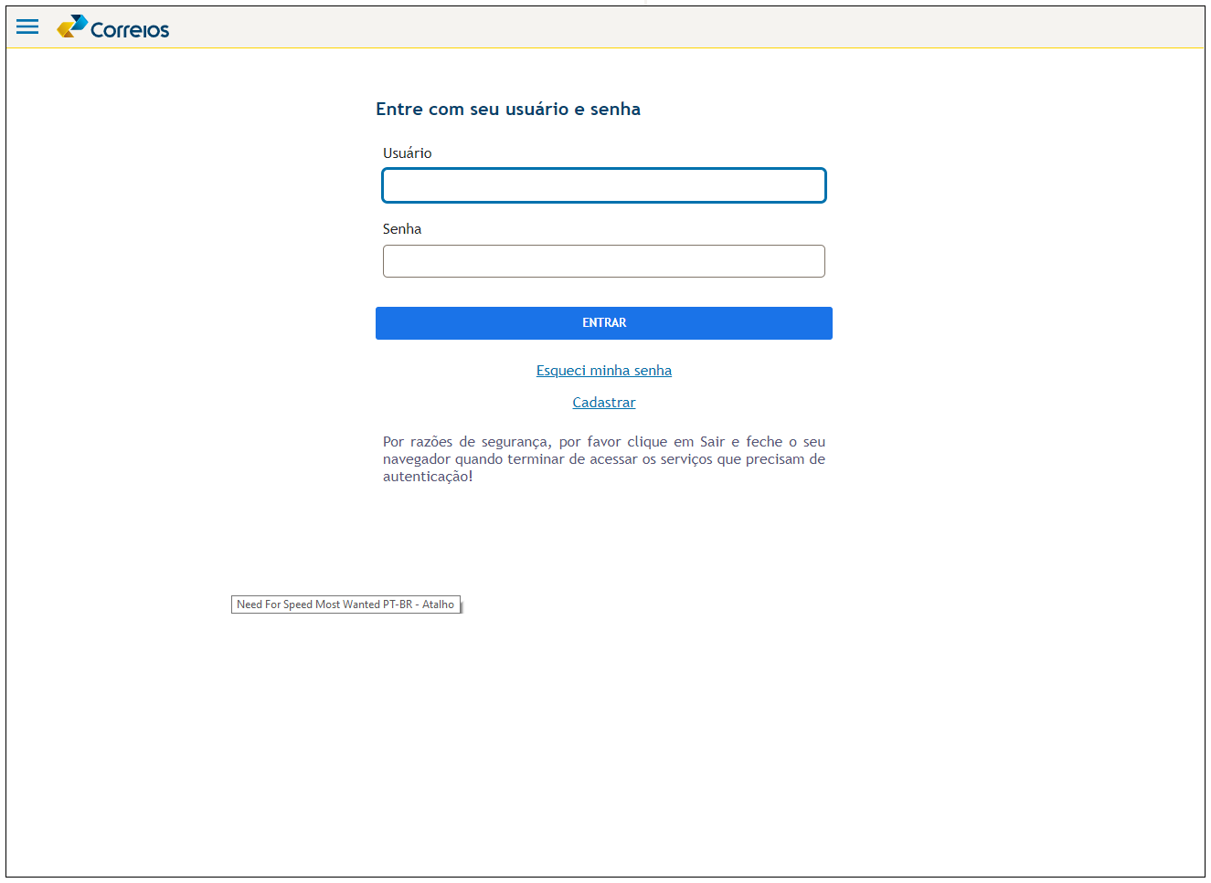 O Relatório Faturamento tem a função acessar a fatura do contrato do cliente diretamente na plataforma dos correios. Para acessar a fatura do contrato do cliente é obrigatório o usuário e senha do responsável. Após clicar no botão Faturamento será inicializada uma pagina de acesso conforme imagem abaixo.