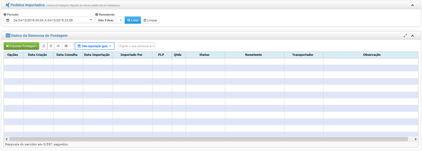Na tela do Marketplaces serão apresentadas todas as PLPs importadas, sendo possível realizar filtros por data de importação e remetentes.