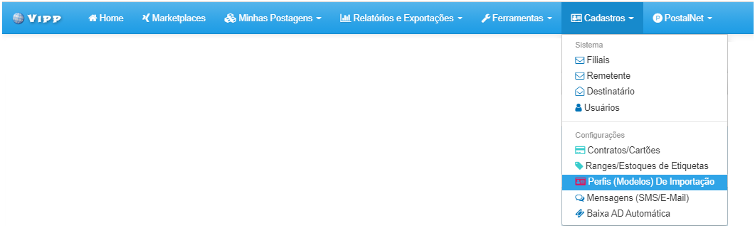 1º Acesse o Menu Cadastros>Perfis (Modelo) de Importação. (Conforme Ilustra Imagem Abaixo)