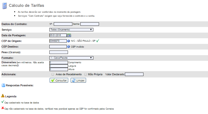 ApresentaçãoAjuda do AdministradorMais Opções Cálculo de Tarifas ATUALIZAÇÕES DO SITE - Opções para atualizar informações/dados do Site. Veja Também: Consulta CEP Tarifas (Site ECT) Calculo de Tarifas Conferir Parâmetros Webmail