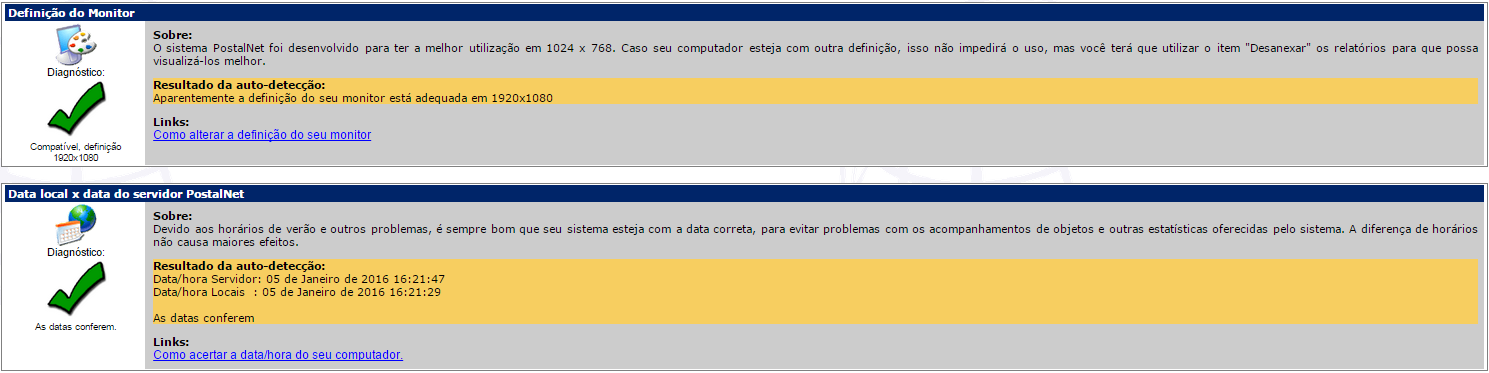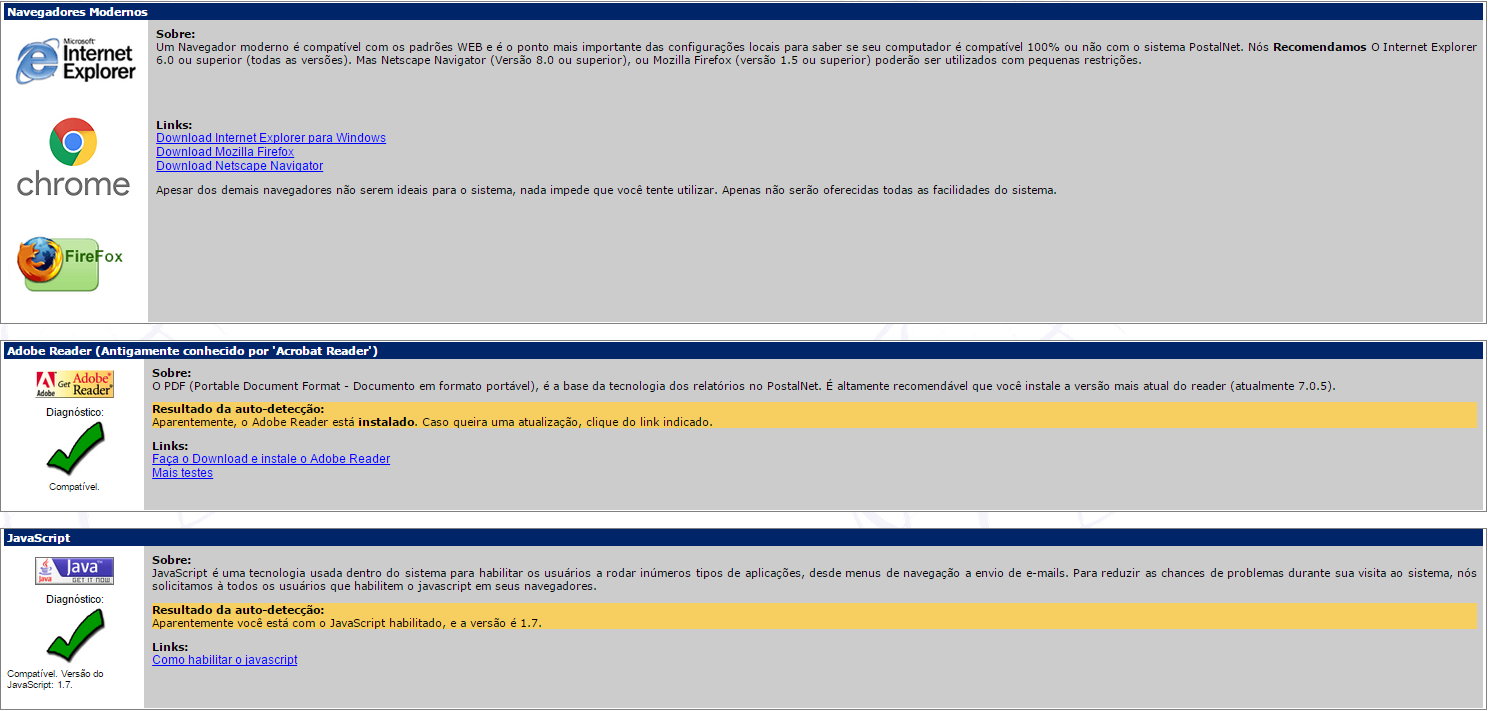 Nós criamos este teste de compatibilidade básica, para verificar se seu navegador tem os requisitos mínimos necessários para a boa utilização do sistema PostalNet. Este teste irá listar os softwares necessários e oferecerá alguns arquivos de teste e instruções para Atualização (upgrade), caso seja necessário.