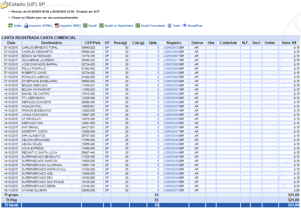 Ao clicar no Estado(UF)o mesmo informará todos os objetos postados pelo cliente referente a UF conforme imagem abaixo: