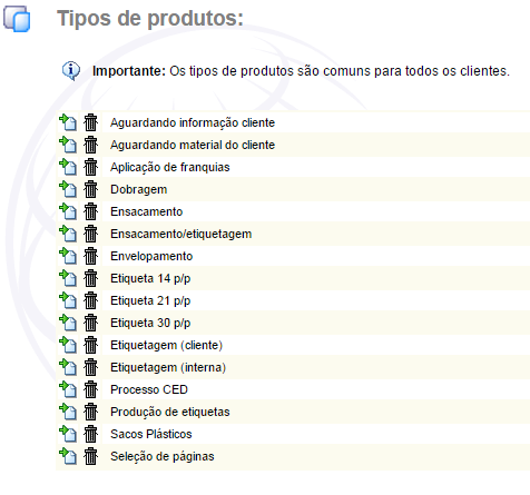 ApresentaçãoAjuda do AdministradorManutençãoManuseio (Ocorrências) Tipos de Produtos (Manutenção > Tipos de Produtos) Veja Também: Criar Ocorrencias Cliente Alterar Ocorrencias Controle Manuseio Tipos de Produtos