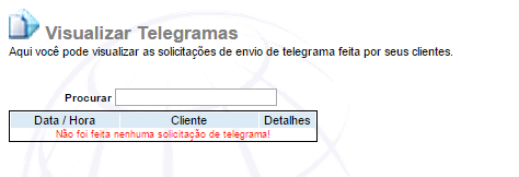 ApresentaçãoAjuda do AdministradorManutençãoEstatisticas Visualizar Telegramas (Manutenção → Estatísticas) - Visualizar Telegramas Segue abaixo exemplo: Veja Também: Logs do Servidor Logon com Sucesso Abriu o Boleto Solicitações Rastreamento Solicitações E-Mail Visualizar Coletas Visualizar Telegramas Outros Eventos Gráfico Geral