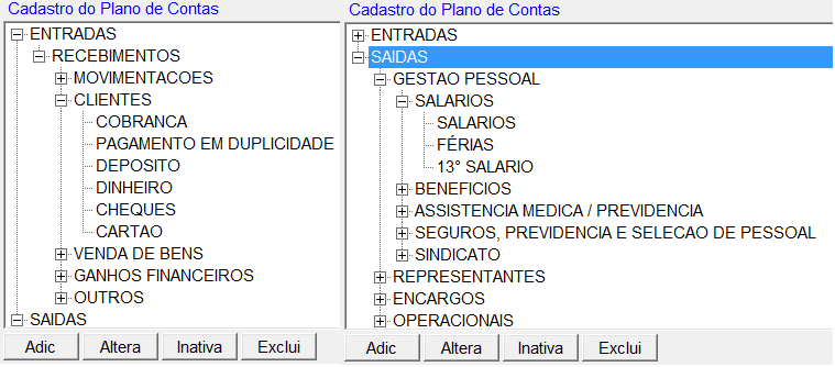Para um melhor controle da sua empresa o plano de contas foi montado com uma estrutura de três níveis que neste manual vamos chamar de Pai, Filho e Neto. A única informação básica e que não poderá sofre modificação são os grupos entrada e saída, agora qualquer lançamento a ser realizado será efetuado sempre no Neto.