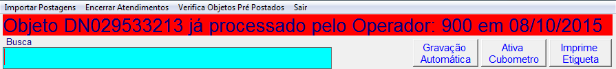 Se um operador efetuar a leitura de um objeto já conferido pelo sistema, o mesmo irá mostrar uma mensagem mostrando que o objeto já foi processado informando o operador e a data na qual este processamento ocorreu.