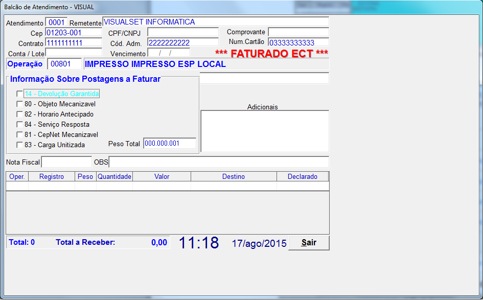Faturado ECT Sem Comprovante: Esta operação é identificada pelo código financeiro do serviço, pois todos são cadastrados internamente no sistema e também pelo tipo do atendimento faturado ECT. A impressão do comprovante deste atendimento não é feita automaticamente pelo balcão, ela deve ser feita por relatórios diários / lista de postagem faturado ECT (ver item 5.9 Relatórios).